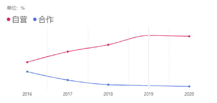 公司自 2015年采取“堅持自營、減少聯(lián)營”政策以來,自營率逐年提高,2015年自營率約60%,2020年自營率已達到94%以上。