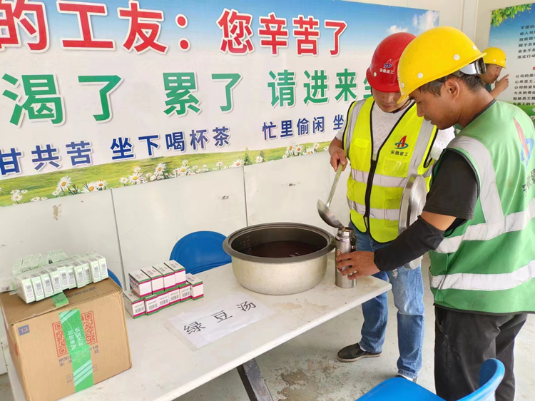 所有的安全活動(dòng)是為了更好的,更放心的生產(chǎn),實(shí)現(xiàn)安全和發(fā)展的良性循環(huán)。進(jìn)入6月后,天氣逐漸炎熱,多日持續(xù)高溫,項(xiàng)目上為了確保工人施工安全,每日免費(fèi)提供藿香正氣水、仁丹和綠豆湯,并安排專人巡查,有因高溫不適的工人,及時(shí)通知休息,確保安全高效的生產(chǎn)。