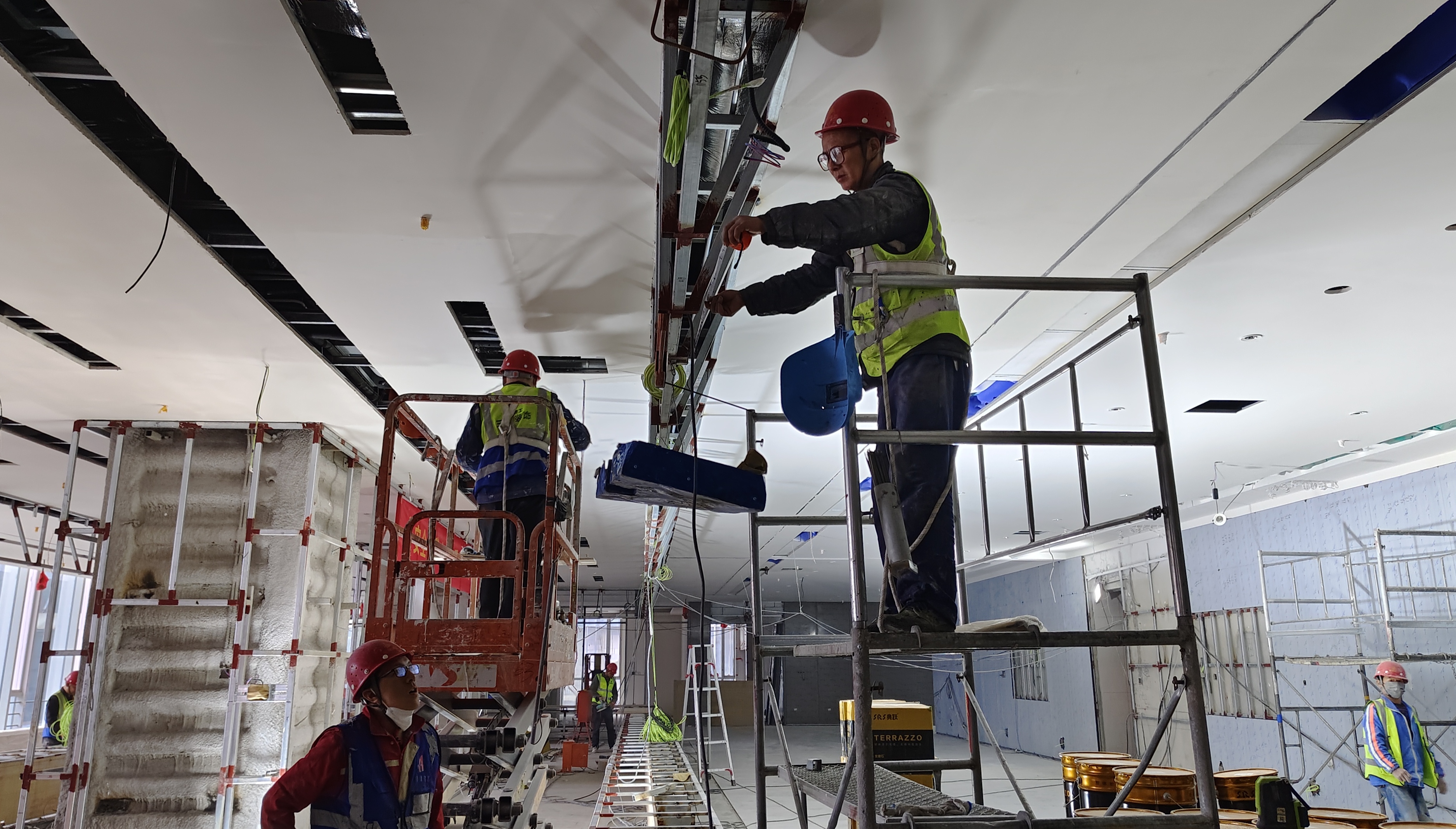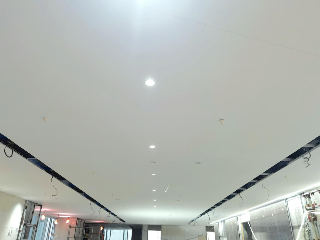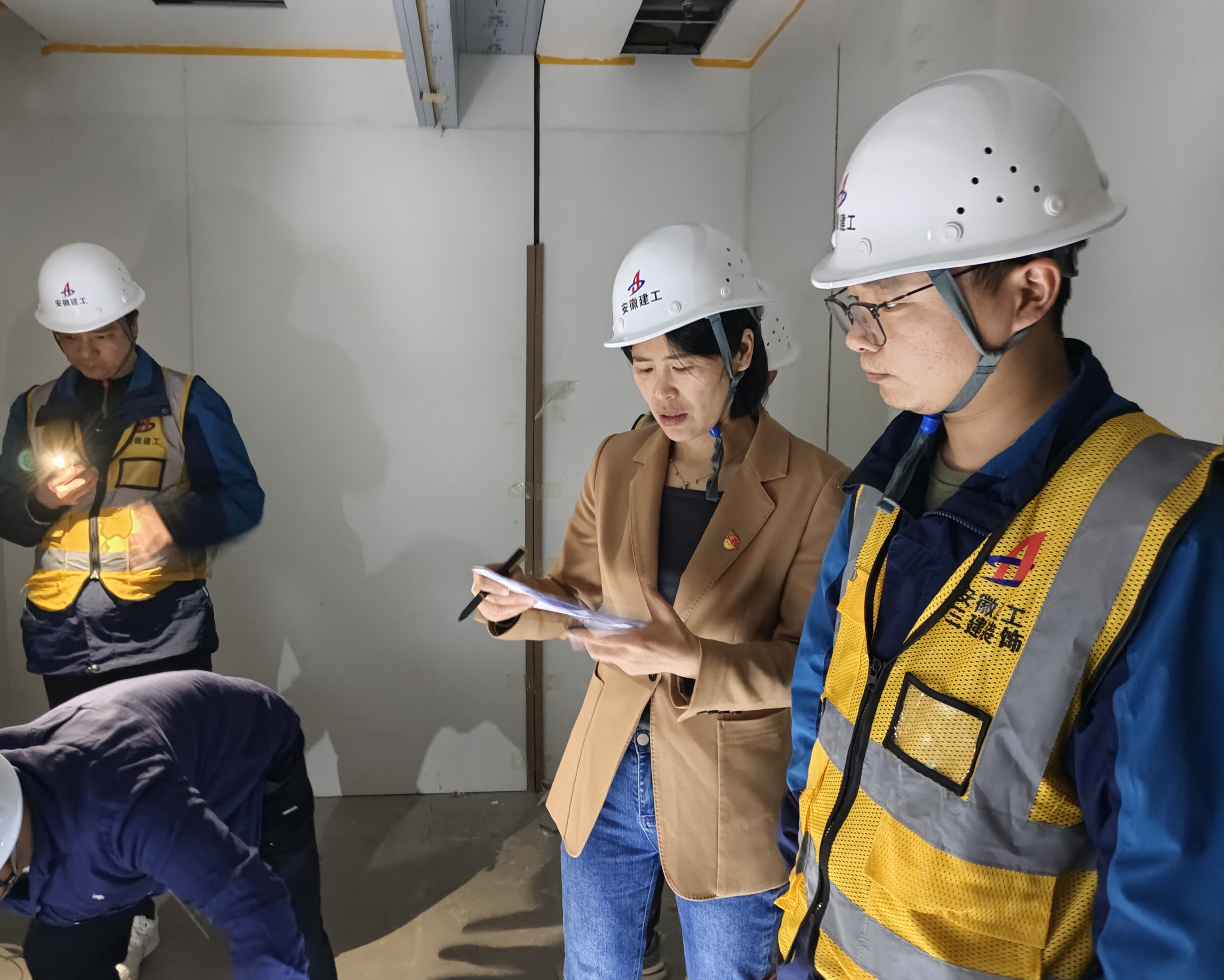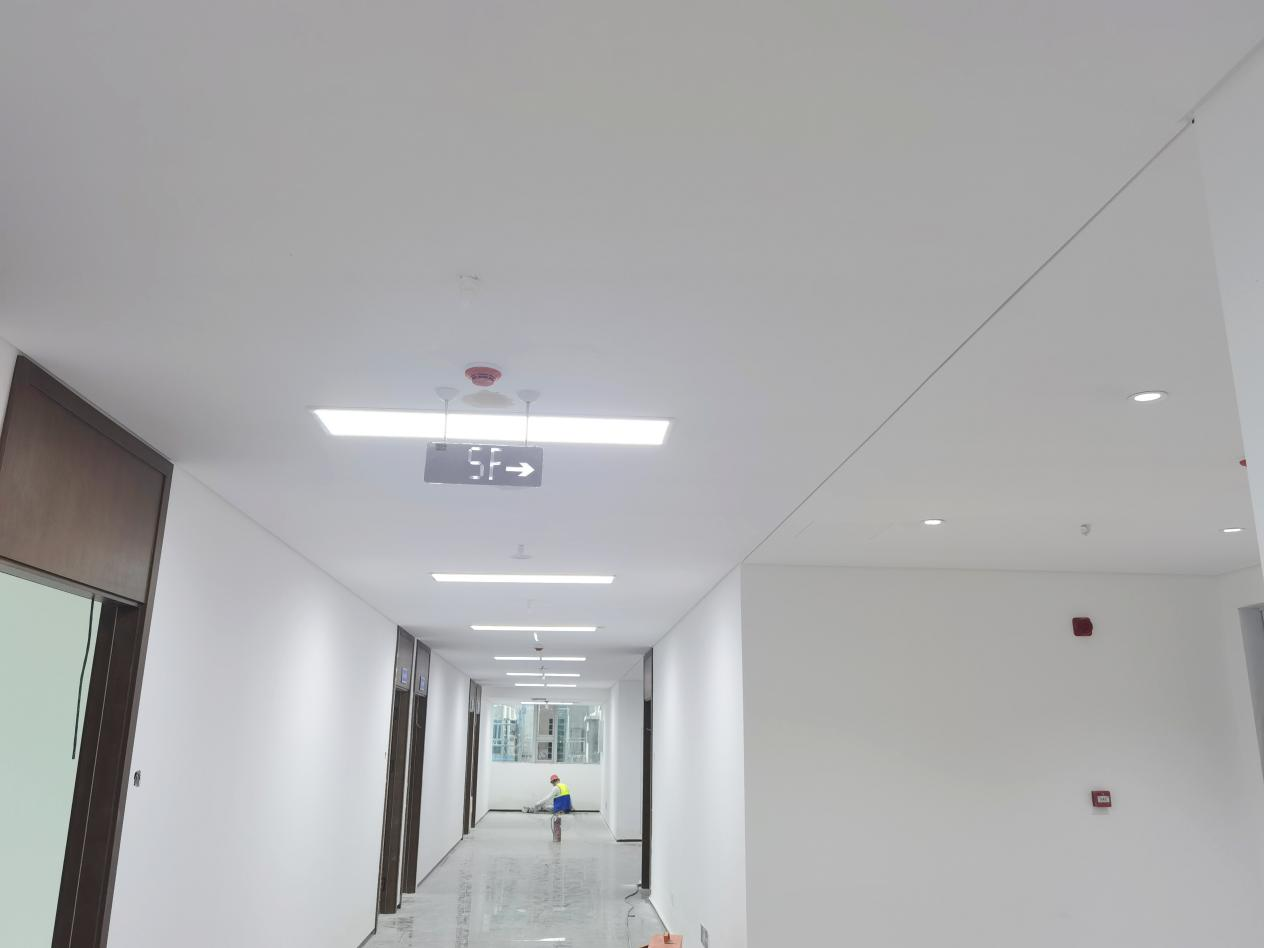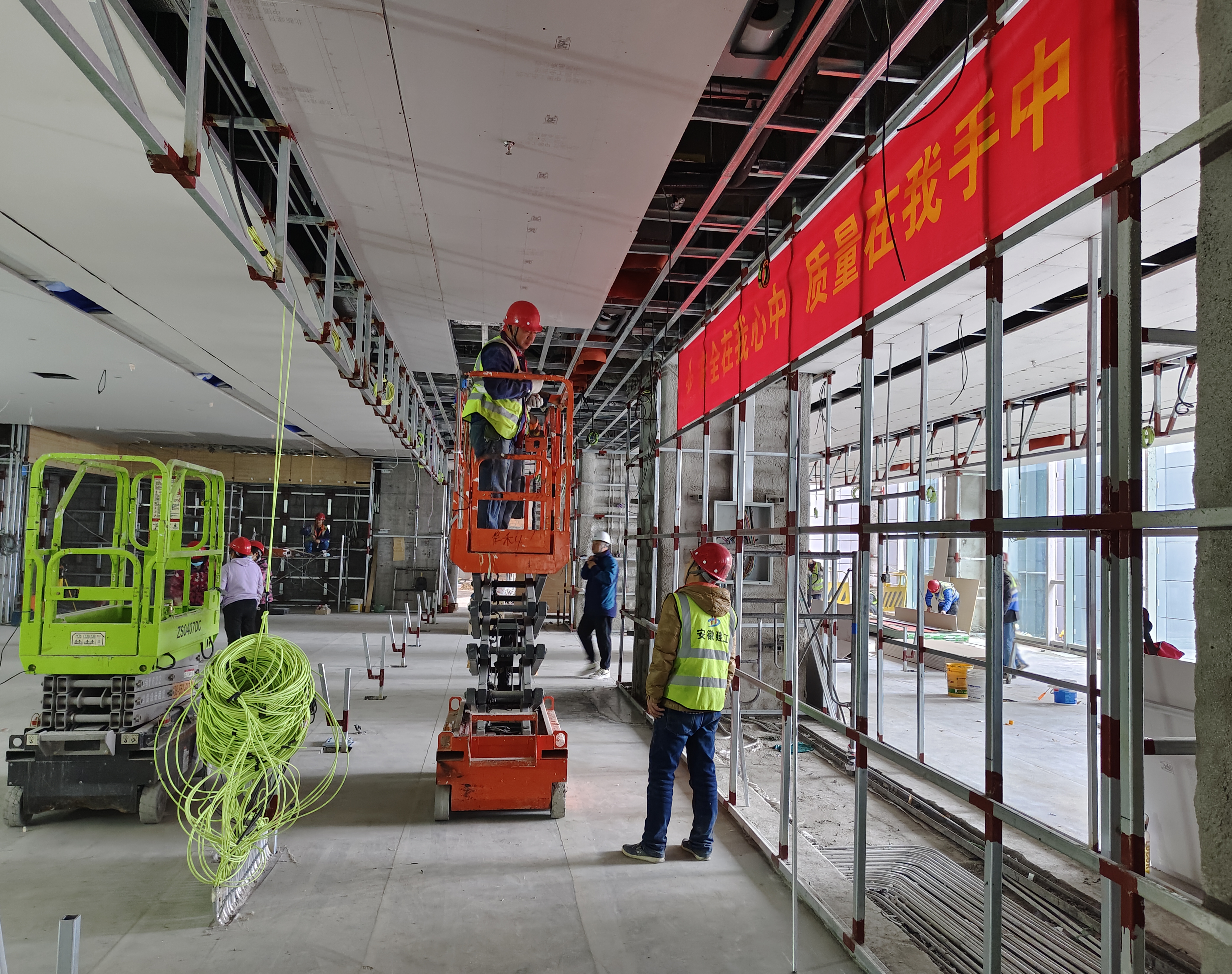 ②樓層裝飾裝修及安裝施工:輕質(zhì)隔墻已全部完成,頂面封板完成,頂面安裝工程已完成95%,正在進行機電、空調(diào)、智能化等收尾工作;墻面裝飾基層已完成,墻頂面飾面板安裝完成45%,木門安裝完成60%,核心筒外圍以及樓梯間地磚鋪貼完成,衛(wèi)生間防水已完成,衛(wèi)生間地磚鋪貼已完成,衛(wèi)生間墻磚已完成,電梯廳墻磚已完成,自流平完成95%,石塑地板安裝完成30%。
