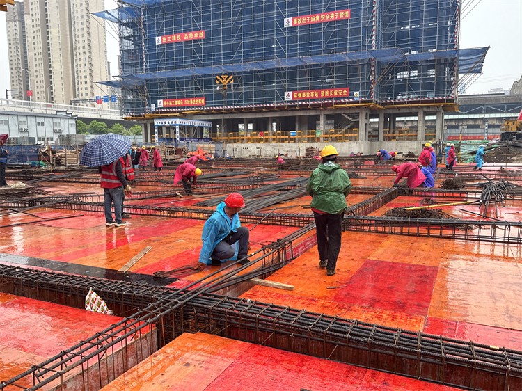 項(xiàng)目迅速組織召開(kāi)勞動(dòng)競(jìng)賽工作小組會(huì)議,充分發(fā)揮“兩個(gè)作用”匯聚生產(chǎn)動(dòng)能。項(xiàng)目黨員充分發(fā)揮先鋒模范作用,沖鋒在前,引領(lǐng)項(xiàng)目全體職工統(tǒng)一思想、團(tuán)結(jié)奮斗,咬緊關(guān)鍵工期節(jié)點(diǎn)不松口。面對(duì)鋼筋原材不足難題,項(xiàng)目發(fā)揮釘釘子精神,加強(qiáng)溝通對(duì)接,加快推進(jìn)鋼筋原材進(jìn)場(chǎng)工作,同時(shí)積極同聯(lián)合體單位協(xié)商臨時(shí)借調(diào)鋼材。針對(duì)連續(xù)陰雨天氣影響施工進(jìn)度問(wèn)題,項(xiàng)目青年突擊隊(duì)集思廣益,多次研討確保節(jié)點(diǎn)工期任務(wù)的解決方案,同時(shí)對(duì)人防口部墻板集中部位采用架設(shè)固定式遮雨棚及移動(dòng)式遮雨棚措施,給工人提供安全的雨天施工作業(yè)條件。
