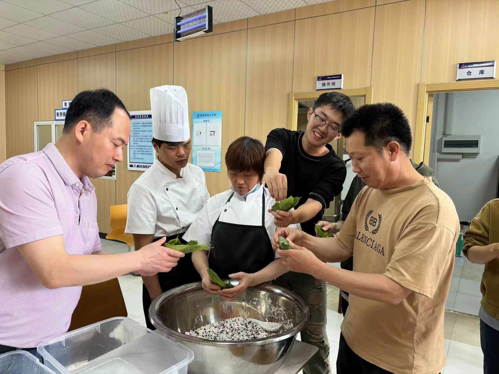 合肥理工學院項目組織管理人員包粽子,項目管理人員齊上陣,不一會,一個個翠綠誘人的粽子就呈現在大家眼前,項目部一派歡樂溫馨的氛圍。
