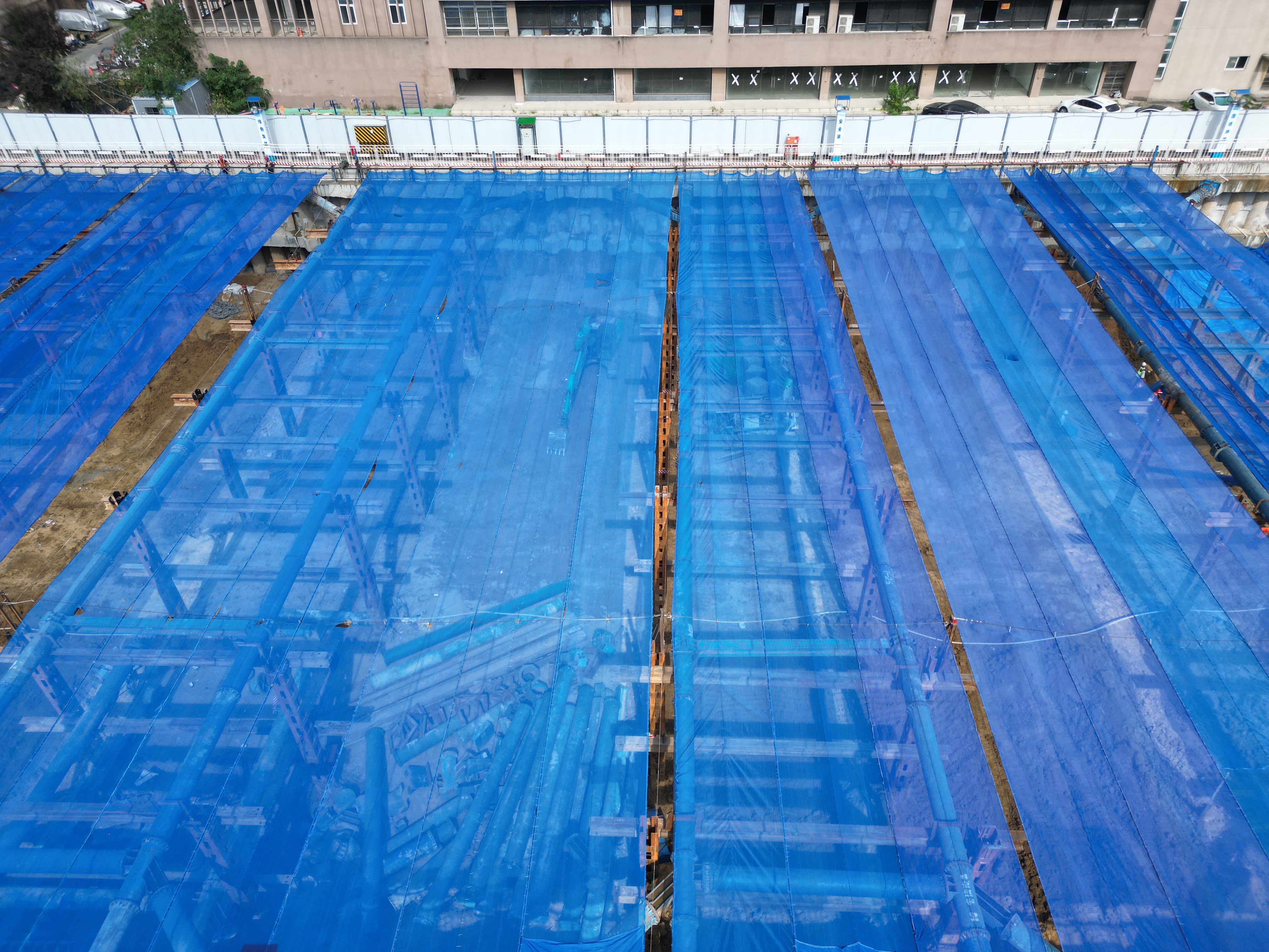 該項(xiàng)目距離市二院住院部及居民區(qū)較近,為減小對人居環(huán)境的影響,啟用“天幕系統(tǒng)”是貫徹落實(shí)高質(zhì)量發(fā)展、探索綠色低碳發(fā)展的切實(shí)舉措。與傳統(tǒng)的施工作業(yè)相比,防塵天幕能夠減少80%以上的揚(yáng)塵,實(shí)現(xiàn)6520平方米的基坑全覆蓋。在土方開挖和錨噴作業(yè)過程中,啟用基坑防塵天幕系統(tǒng)的同時(shí)與噴淋系統(tǒng)結(jié)合使用,通過“天幕”系統(tǒng)將“露天作業(yè)”變?yōu)椤笆覂?nèi)作業(yè)”,實(shí)現(xiàn)整個(gè)基坑施工場地“綠色封閉式”管理。