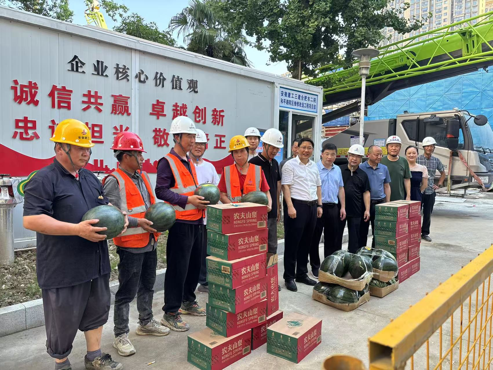 在施工現(xiàn)場,機器轟鳴,工人們頂著烈日緊張忙碌著,儲院長一行來到他們中間,與大家親切握手,詳細詢問了他們的工作強度、作息時間以及防暑降溫措施落實情況。隨后,院領(lǐng)導們將精心準備的防暑降溫物資,如礦泉水、西瓜、藿香正氣水、清涼油等一一送到工人手中,并反復叮囑大家在高溫作業(yè)時要注意勞逸結(jié)合,做好自身防護,確保安全施工。