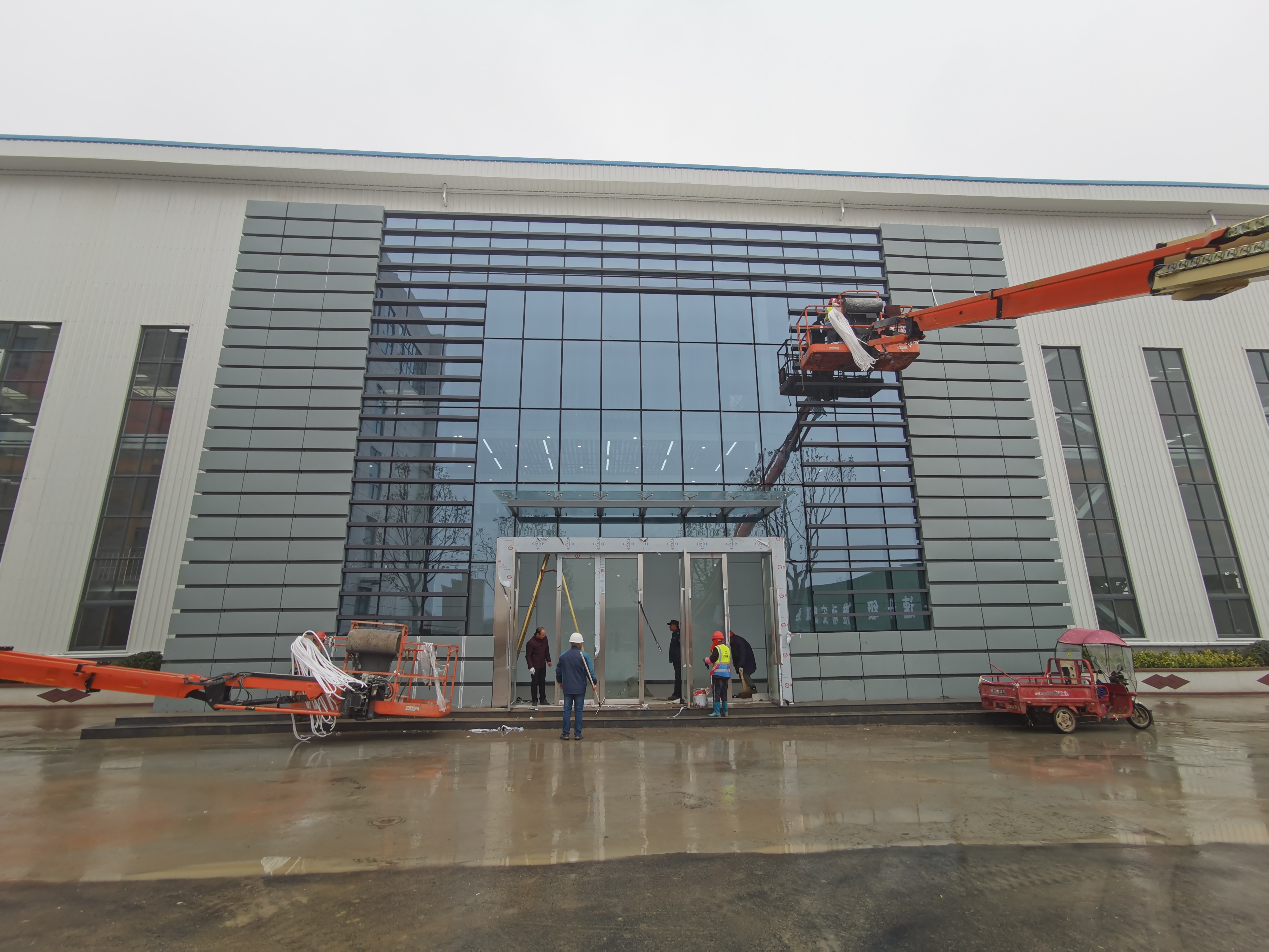面對時間緊任務(wù)重,定制的鋁型材、玻璃、鋁板等材料加工周期長等困難,裝飾項目經(jīng)理李斌帶領(lǐng)項目團隊堅定目標,仔細研究施工方案、合理安排工序、精心施工。自進場,項目部積極和廠家溝通協(xié)調(diào),24小時不停歇連續(xù)加工,為順利完成新增門廳及二層實驗室提供了有力保障。施工期間正逢連陰雨天氣,總用時13天,期間連續(xù)陰雨7天,給項目增加了高空作業(yè)難度及風(fēng)險系數(shù),項目部實時關(guān)注天氣情況,合理安排鋼結(jié)構(gòu)、內(nèi)裝飾、外幕墻穿插并行施工,抓住雨停間隙,大雨小干、小雨大干、雨停加油干。