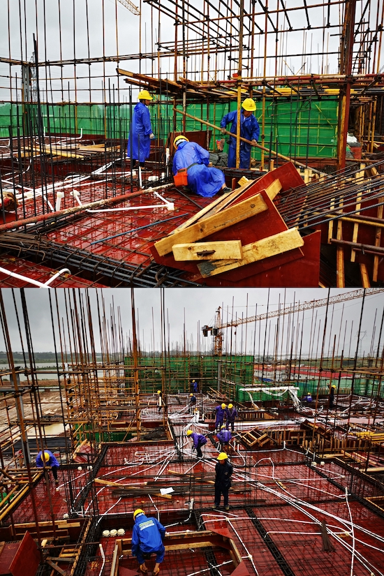 圖為項(xiàng)目管理人員及班組工人雨天搶工