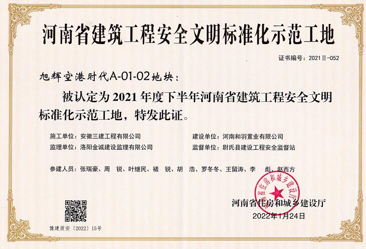 旭輝空港時代項目獲評河南省“建筑工程安全文明標(biāo)準(zhǔn)化示范工地”稱號