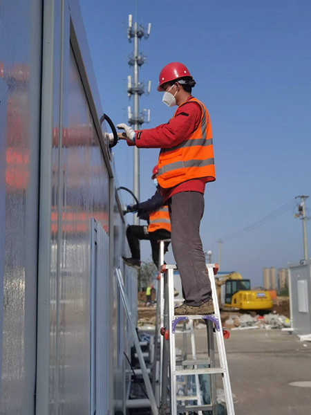 夜幕降臨,合肥春天的夜晚仍夾雜著絲絲涼意,肥西縣疫情隔離點(diǎn)備用區(qū)(三期)工程,塔吊在大功率的光源下仍進(jìn)行著吊裝作業(yè),在吊臂下落的打包箱配件的不遠(yuǎn)處,二公司安全員任杉杉戴著安全帽,向著吊車司機(jī)喊道“慢、慢、慢”,在打包箱房頂配件緩緩落在箱房的支撐點(diǎn)之時(shí),數(shù)名操作工立即手持電動(dòng)機(jī)械找準(zhǔn)各個(gè)支撐點(diǎn)位,用最快速度完成安裝工作。