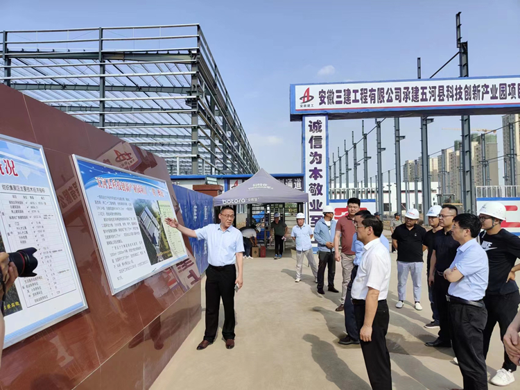 金勝慶一行先后深入五河縣科技創(chuàng)新產(chǎn)業(yè)園項(xiàng)目、五河縣紡織集聚區(qū)項(xiàng)目施工現(xiàn)場(chǎng),聽(tīng)取項(xiàng)目在建設(shè)進(jìn)度、安全生產(chǎn)、疫情防控等方面工作匯報(bào),詢問(wèn)了解項(xiàng)目推進(jìn)中遇到的問(wèn)題,協(xié)調(diào)相關(guān)部門(mén)現(xiàn)場(chǎng)研究解決辦法,充分肯定了五河縣科技創(chuàng)新產(chǎn)業(yè)園項(xiàng)目、紡織集聚區(qū)項(xiàng)目進(jìn)場(chǎng)以來(lái)取得的成績(jī),高度肯定安徽三建國(guó)企擔(dān)當(dāng)、國(guó)企品質(zhì)。金勝慶表示,安徽三建要繼續(xù)高標(biāo)準(zhǔn)、嚴(yán)要求,打造精品工程,在確保安全和質(zhì)量的基礎(chǔ)上,嚴(yán)格按照時(shí)間任務(wù)節(jié)點(diǎn),科學(xué)謀劃、統(tǒng)籌安排,做好工程調(diào)度,強(qiáng)化監(jiān)管,確保項(xiàng)目早建成、早使用;相關(guān)部門(mén)要加強(qiáng)統(tǒng)籌協(xié)調(diào),強(qiáng)化服務(wù)保障,形成工作合力,結(jié)合企業(yè)項(xiàng)目建設(shè)情況,幫助企業(yè)解決項(xiàng)目建設(shè)中存在的困難和問(wèn)題,確保每一個(gè)環(huán)節(jié)環(huán)環(huán)相扣,項(xiàng)目能夠落實(shí)到實(shí)處,能夠早建成,高效投產(chǎn)運(yùn)營(yíng)。