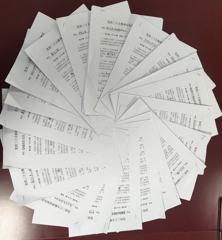 此次測試內(nèi)容緊緊圍繞黨的二十大報告及新修訂的《中國共產(chǎn)黨章程》,題型包括填空題、選擇題、判斷題、簡答題等形式,著重測試黨員及職工群眾對黨的二十大會議精神的掌握情況。測試現(xiàn)場,大家仔細審題,認真答卷,展現(xiàn)出良好的學習作風與端正的考試態(tài)度 ,營造了“以考促學、以學促用”的濃厚氛圍。