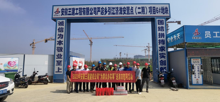 7月22日,建機(jī)公司領(lǐng)導(dǎo)班子一行赴嚴(yán)店鄉(xiāng)引江濟(jì)淮安置點(diǎn)和舒城項(xiàng)目部開展“送清涼”慰問活動(dòng),為項(xiàng)目一線人員發(fā)放毛巾、香皂、清涼油、風(fēng)油精、礦泉水等防暑降溫用品,為烈日下的施工人員送去清涼關(guān)懷。