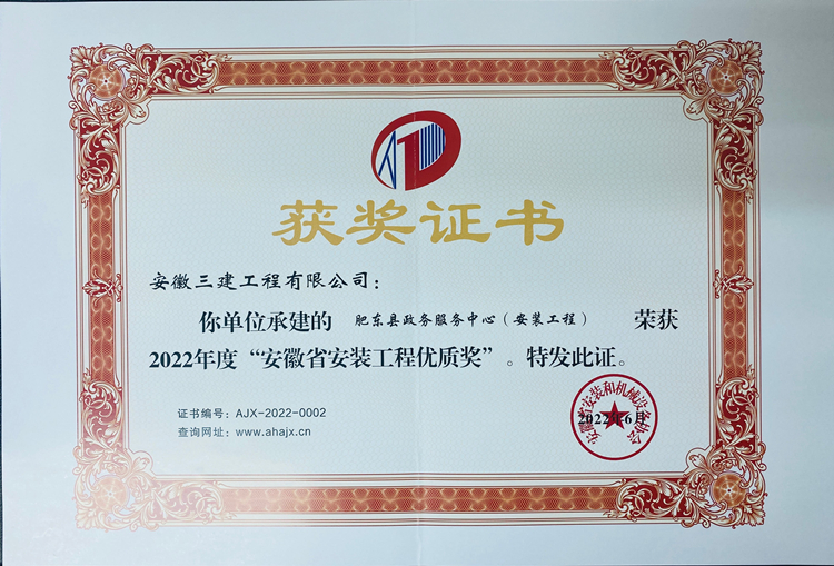 近日,安徽省安裝和機(jī)械設(shè)備協(xié)會(huì)發(fā)布了《關(guān)于公布2022年度“安徽省安裝工程優(yōu)質(zhì)獎(jiǎng)”獲獎(jiǎng)名單的通知》,并頒發(fā)了2021-2022年度安裝工程優(yōu)質(zhì)獎(jiǎng)證書,其中安徽三建承建的“中國(guó)科學(xué)技術(shù)大學(xué)物質(zhì)科學(xué)教研樓(安裝工程)”及“肥東縣政務(wù)服務(wù)中心(安裝工程)”分別榮獲2021年度和2022年度“安徽省安裝工程優(yōu)質(zhì)獎(jiǎng)”。該獎(jiǎng)項(xiàng)是我省安裝行業(yè)工程質(zhì)量的最高榮譽(yù),這也是繼2019-2020年度“合肥市第二人民醫(yī)院”和“安徽創(chuàng)新館”獲評(píng)該獎(jiǎng)后公司連續(xù)四年獲得該獎(jiǎng)項(xiàng),充分體現(xiàn)了安徽三建安裝專業(yè)的雄厚實(shí)力和技術(shù)水平。