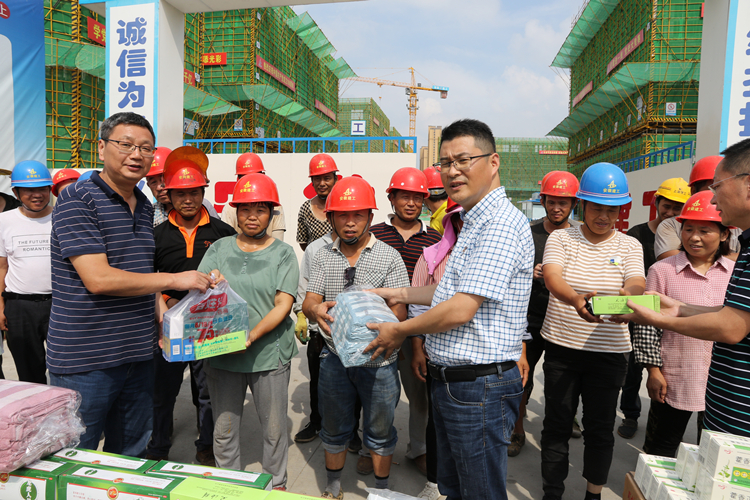 連日來,臨泉縣持續(xù)高溫,為深入開展“我為群眾辦實事”實踐教育活動,7月21日,臨廬產(chǎn)業(yè)園管委會與公司工會共同深入項目施工現(xiàn)場開展“送清涼,送健康,送關(guān)愛”活動,為項目一線員工送去了夏日關(guān)懷,同時叮囑項目管理人員嚴(yán)格做好夏季施工作業(yè)的各項防護(hù)工作,確保高溫天氣施工安全。臨廬產(chǎn)業(yè)園管委會副主任曹曙光、規(guī)劃建設(shè)局局長臧應(yīng),公司副總經(jīng)理張為政等參加慰問。