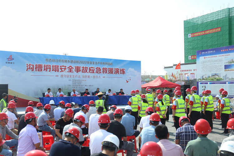 為深入推進(jìn)全國“安全生產(chǎn)月”活動(dòng),切實(shí)提升企業(yè)安全管理與應(yīng)急管理能力,6月26日下午3時(shí),肥西縣在我公司產(chǎn)融項(xiàng)目舉行“建設(shè)工程溝槽坍塌安全事故應(yīng)急救援演練”活動(dòng)。參加此次活動(dòng)有肥西縣副縣長(zhǎng)衛(wèi)涌波,肥西縣住房和城鄉(xiāng)建設(shè)局局長(zhǎng)劉家興,副局長(zhǎng)柳振,黨委委員、總工程師湯道勝,花崗鎮(zhèn)副書記、副鎮(zhèn)長(zhǎng)程子光,肥西縣城鄉(xiāng)建設(shè)投資(集團(tuán))有限公司總經(jīng)理?xiàng)钪久鳎?/span>公司黨委委員、副總經(jīng)理張斌及觀摩活動(dòng)的各施工建設(shè)單位人員共計(jì)120余人。