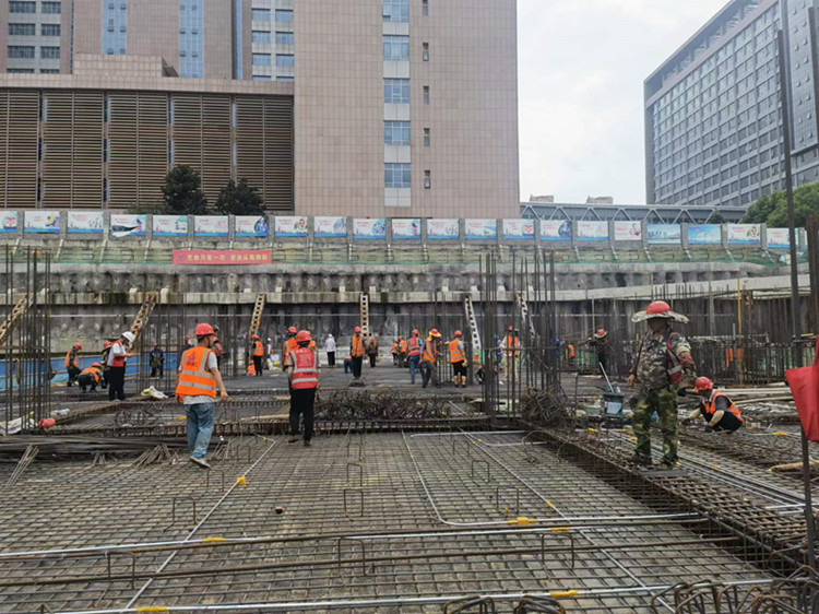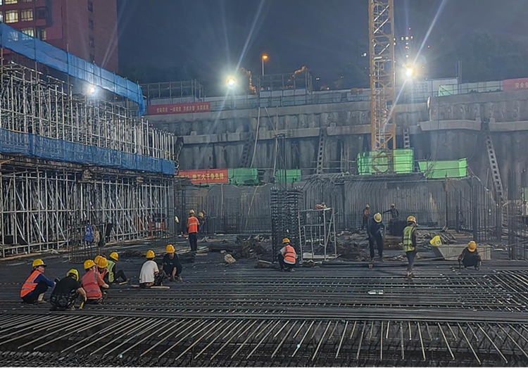 項目地理位置特殊,施工場地狹小,加之前期受土方外運及中高考影響,為項目施工造成諸多困難。為確保施工進度,項目部增加了資源投入,全員采取“5+2、白+黑,陰雨天不停歇”的科學高效輪轉的工作方式,凝心聚力,克服困難,全身心投入到施工現(xiàn)場,確保現(xiàn)場各施工節(jié)點可控。同時針對項目三層地下室及型鋼混凝土結構施工難度大、構造復雜的特點,項目部制定趕工措施,合理安排工序,并做好材料的供應保障,塔吊24小時連續(xù)作業(yè),科學利用有限時間,堅決打好基礎建設攻堅戰(zhàn)。