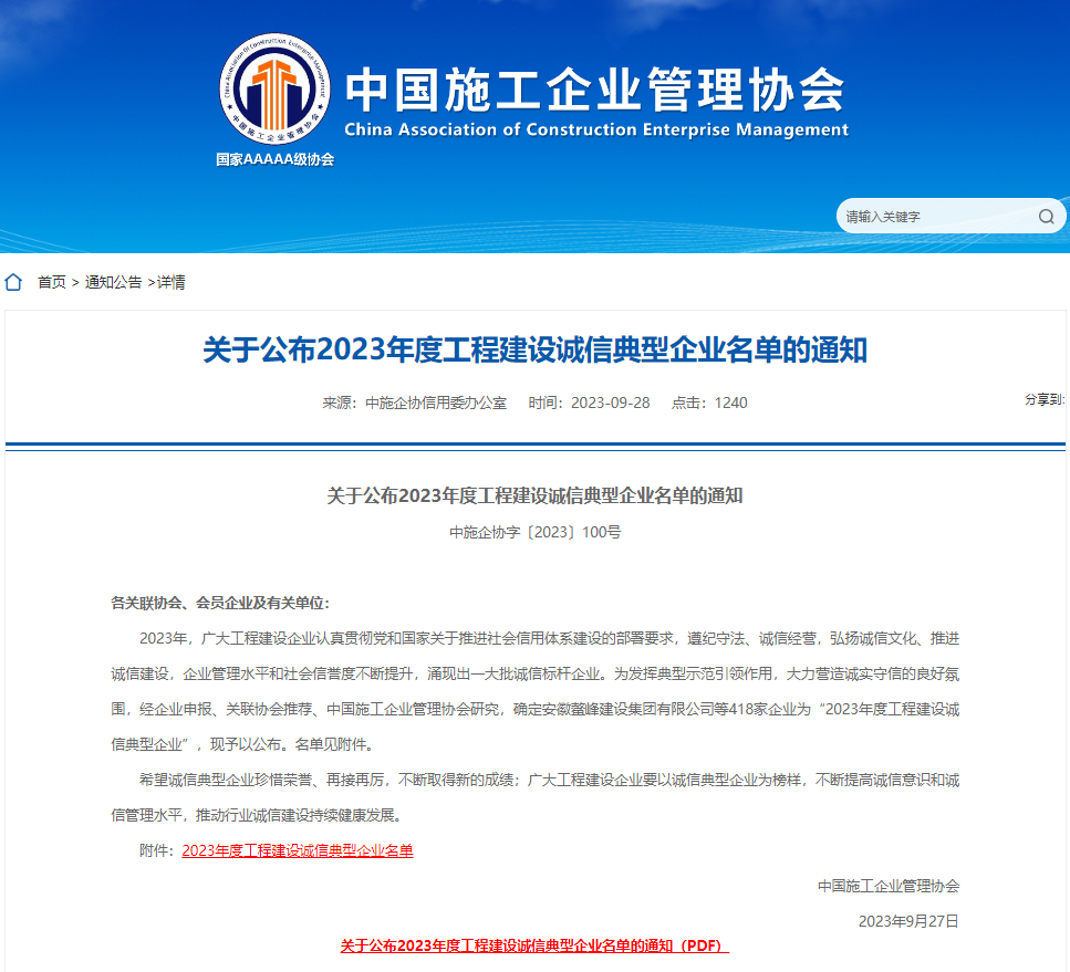 近日,從中國施工企業(yè)管理協(xié)會官網(wǎng)獲悉,安徽建工三建集團有限公司被認定為“工程建設(shè)誠信典型企業(yè)”。