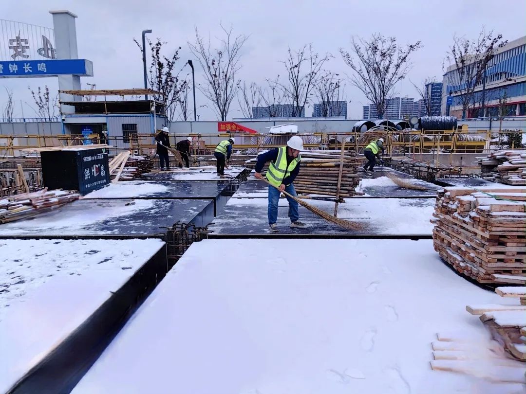蜀山經(jīng)濟產(chǎn)業(yè)園建設(shè)項目現(xiàn)場,為保障項目的施工進度和現(xiàn)場的施工安全,全體管理人員都參與到清掃施工板面積雪的活動中。