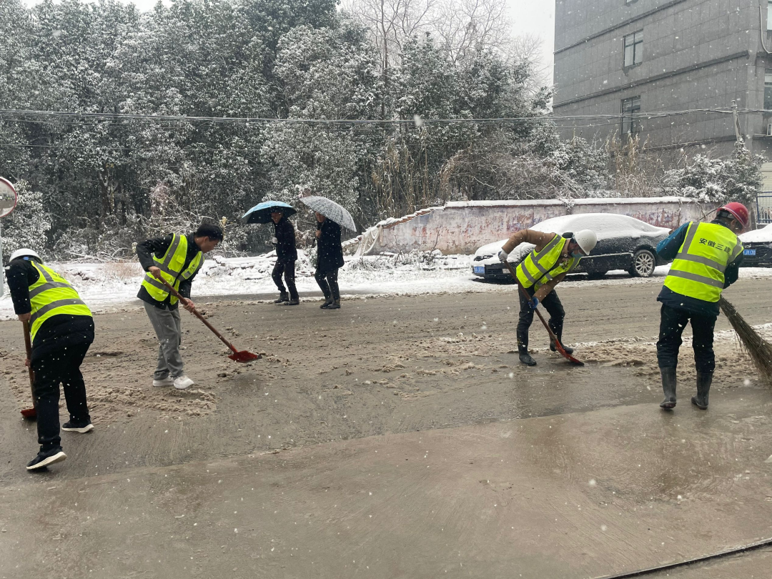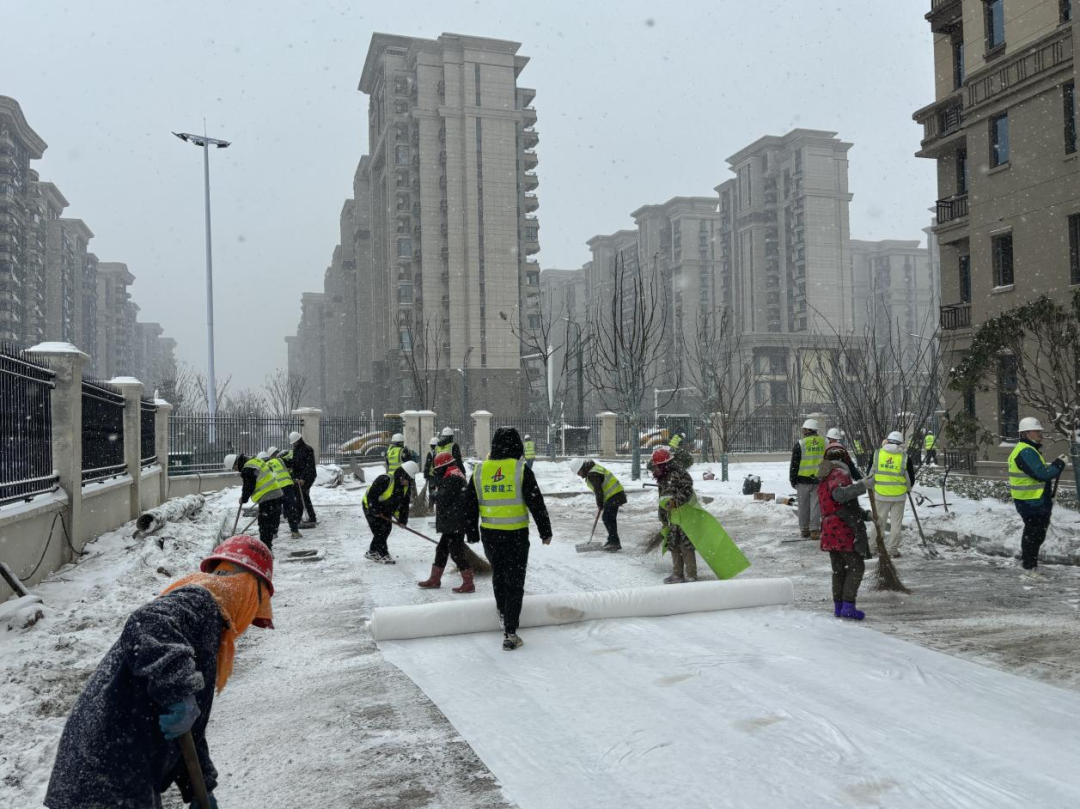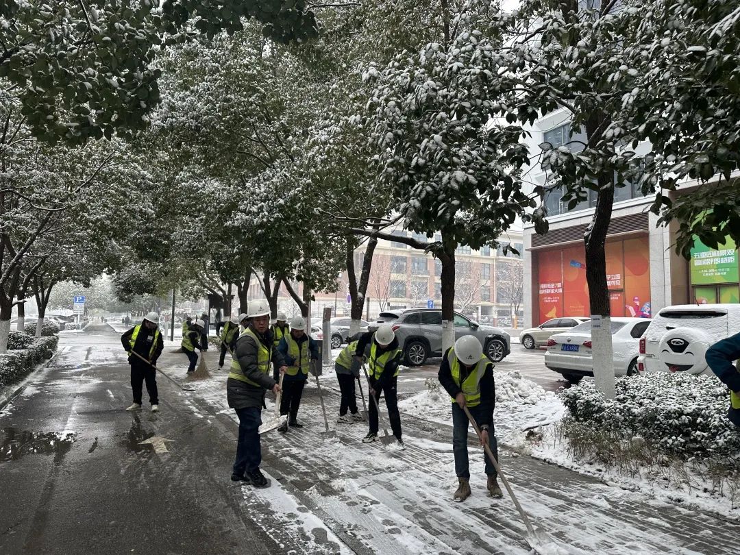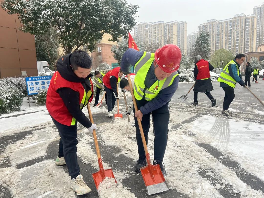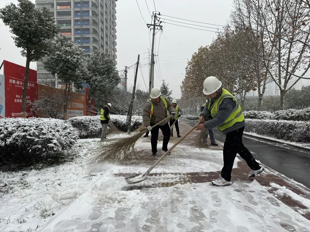潭沖河家園項目組織黨員及40余名管理人員不畏嚴(yán)寒,迅速行動,清理項目周邊積雪,確保周邊道路通暢。