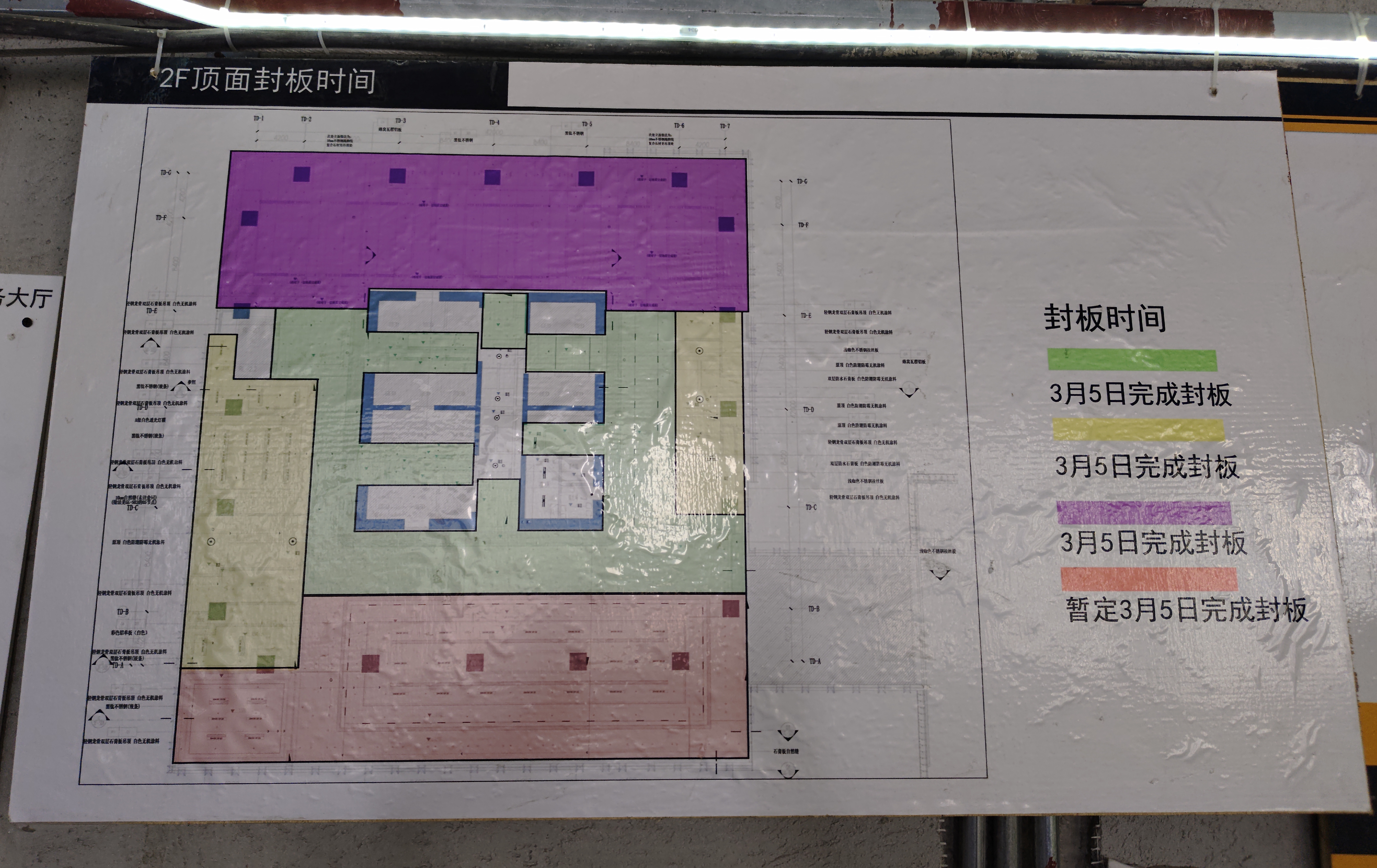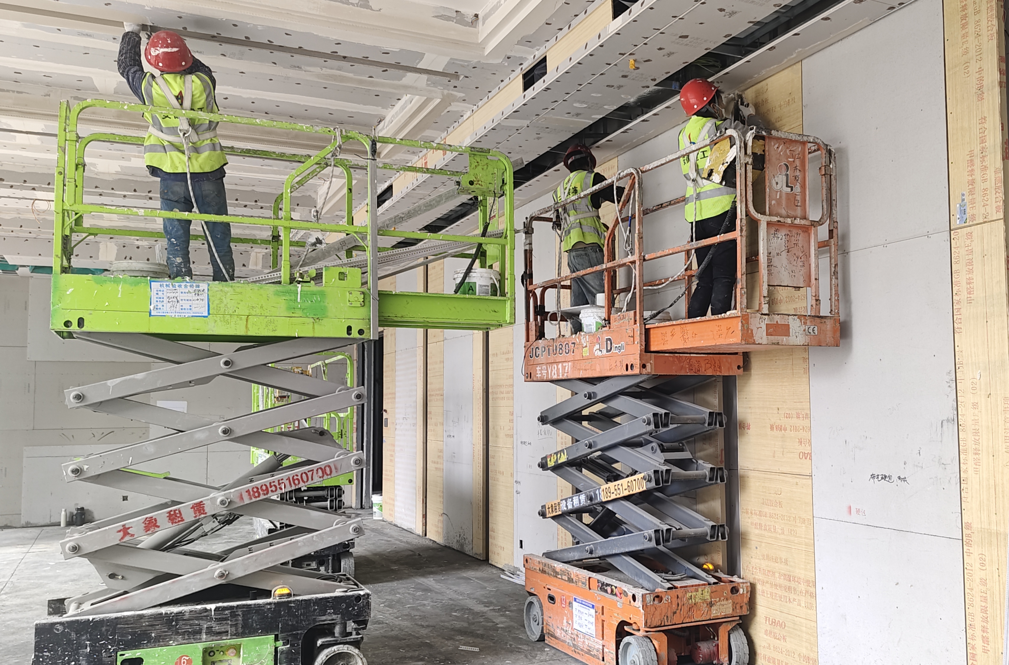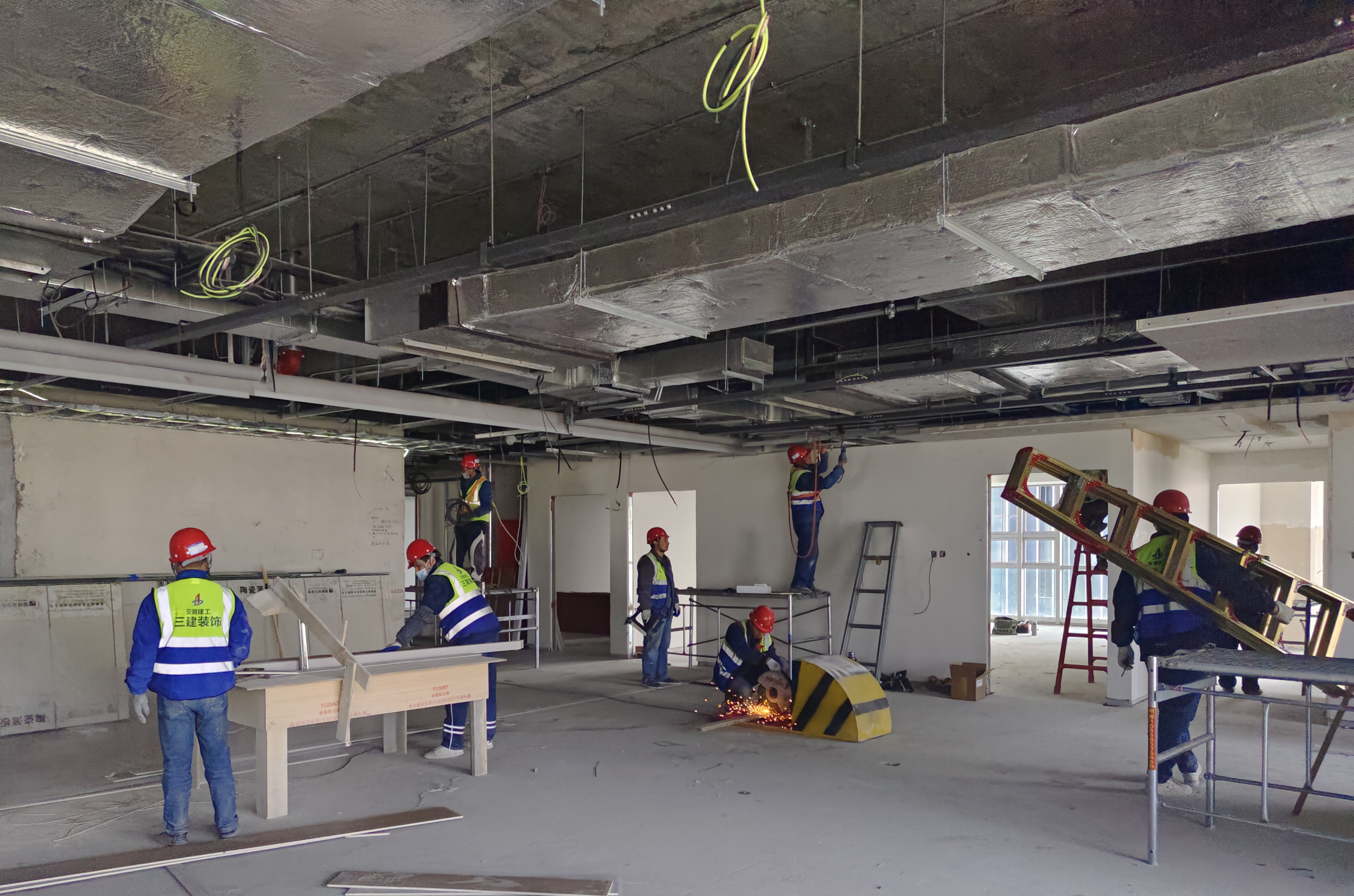 ②4至9層輕鋼龍骨隔墻已完成,吊頂絲桿龍骨完成95%,頂面封板完成90%,地磚鋪貼已完成,衛(wèi)生間防水已完成,墻面裝飾基層已完成,自流平完成30%;
