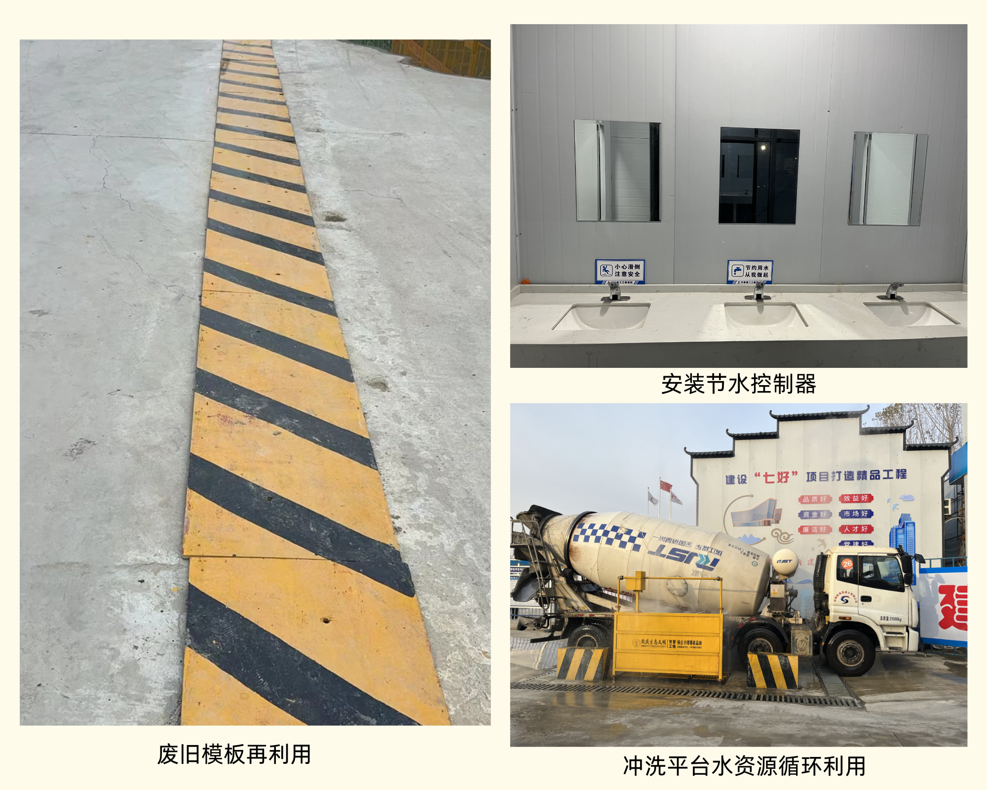 一分公司項目采取廢舊模板再利用,將廢舊模版刷漆亮化后放在后澆帶上,避免出現(xiàn)踩空等安全隱患;衛(wèi)生間安裝節(jié)水控制器節(jié)約水資源;沖洗平臺通過水資源循環(huán)利用,達(dá)到節(jié)約水資源的目的。