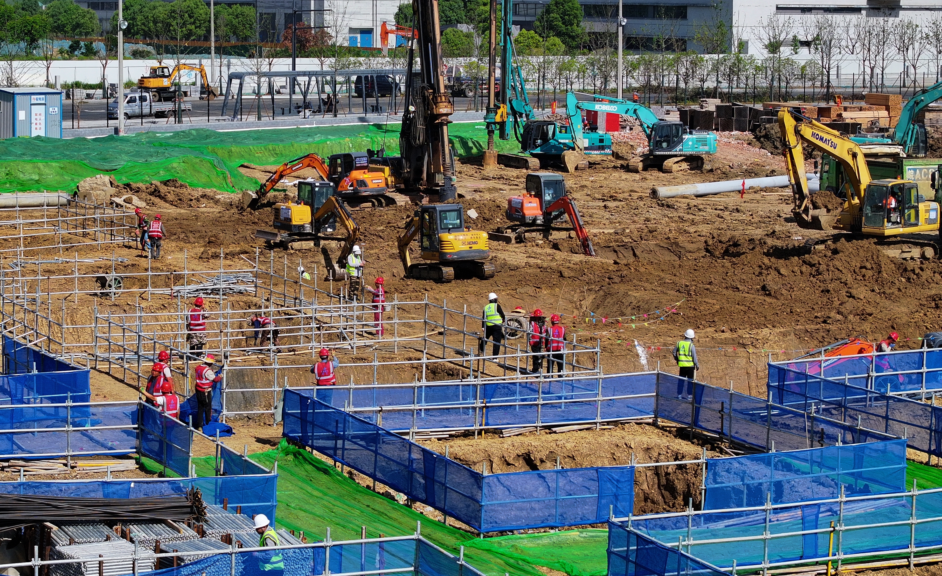 大眾科技三期項(xiàng)目自開(kāi)工以來(lái),為了搶工期、保進(jìn)度,安徽建工三建集團(tuán)采取果斷措施,抽調(diào)40名實(shí)踐經(jīng)驗(yàn)豐富的項(xiàng)目管理人員、245名一線施工人員參與到項(xiàng)目建設(shè)當(dāng)中,同時(shí),集中調(diào)用樁機(jī)12臺(tái)、挖掘機(jī)26臺(tái)、車輛24輛、推土機(jī)3臺(tái),共投入65臺(tái)大型機(jī)械設(shè)備組成大規(guī)?!皺C(jī)械戰(zhàn)隊(duì)”,全方位開(kāi)展施工作業(yè)。