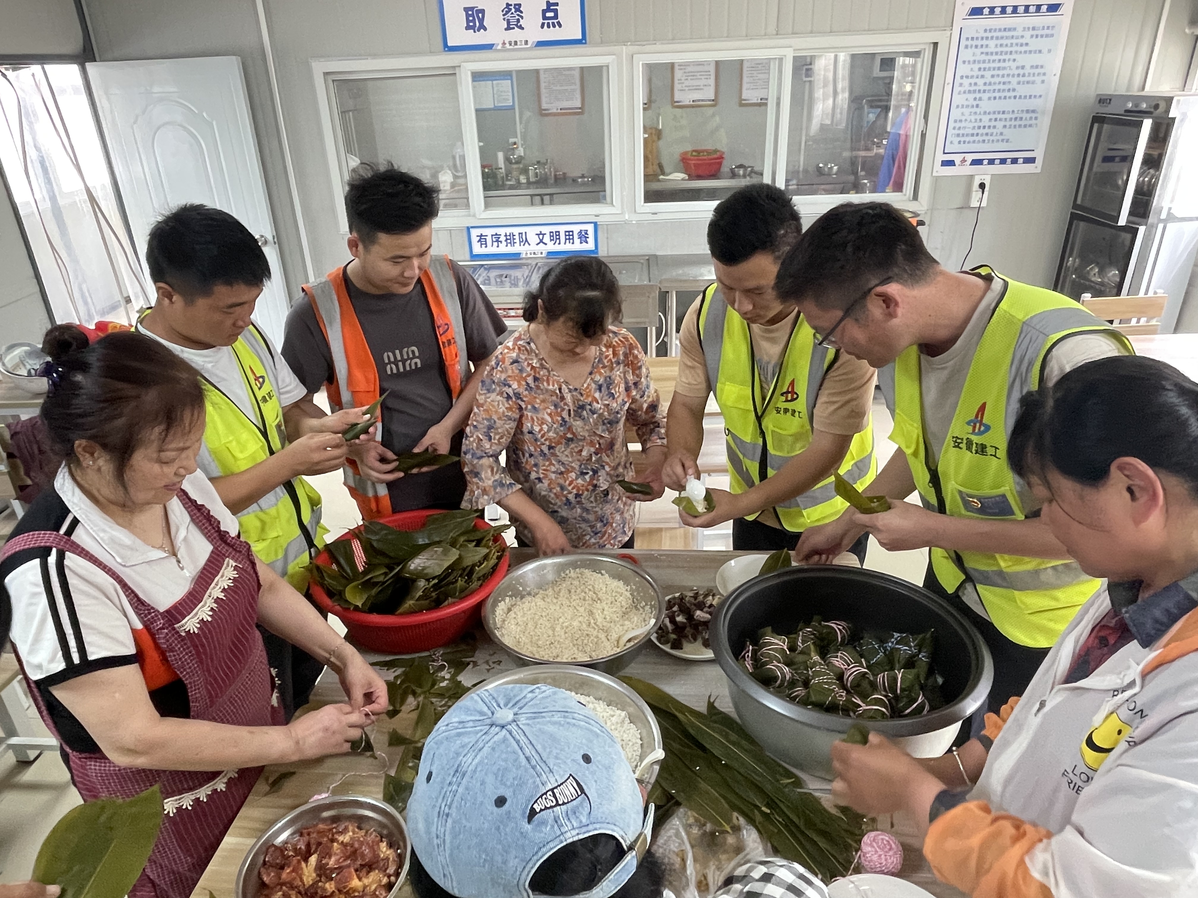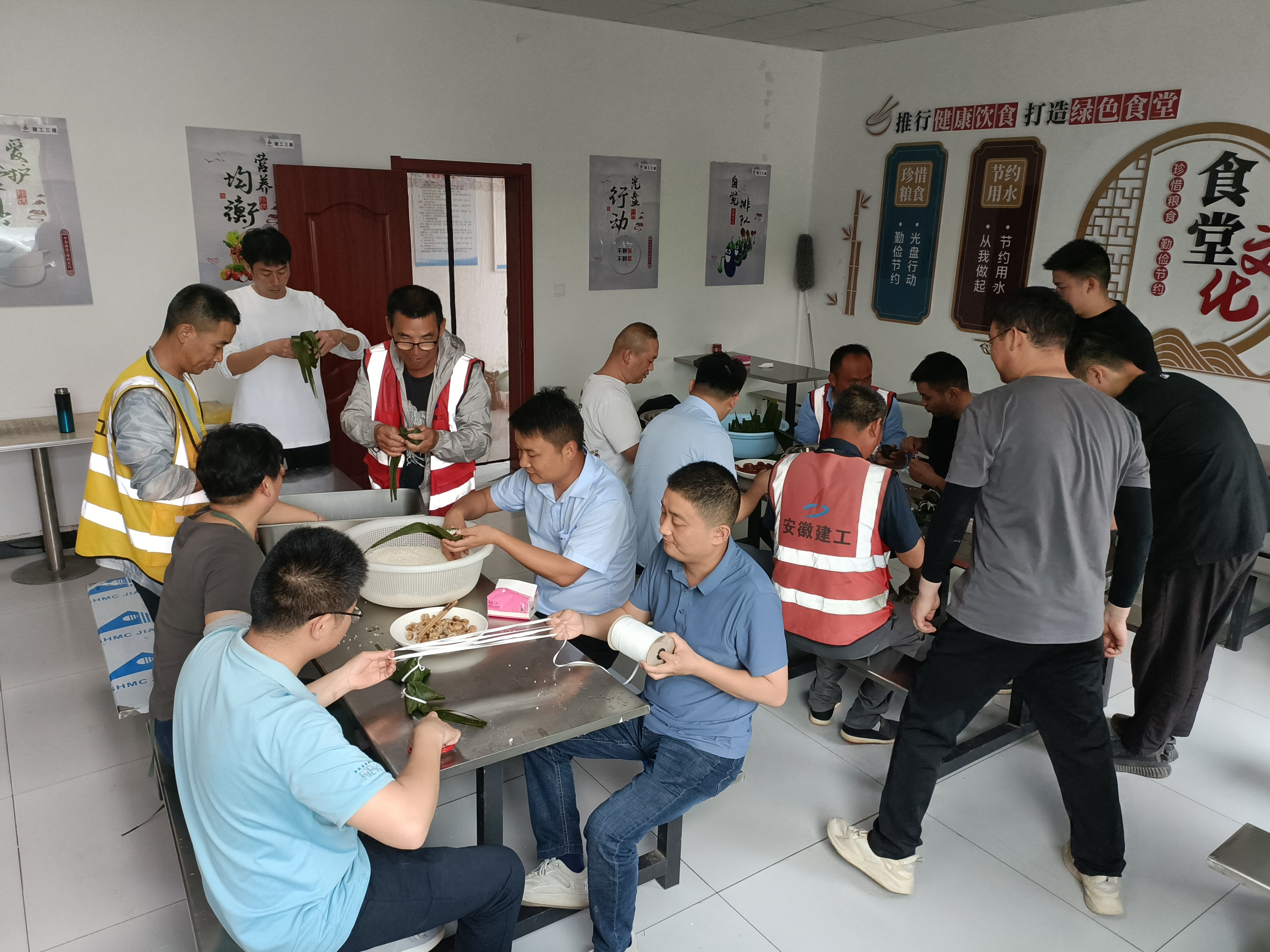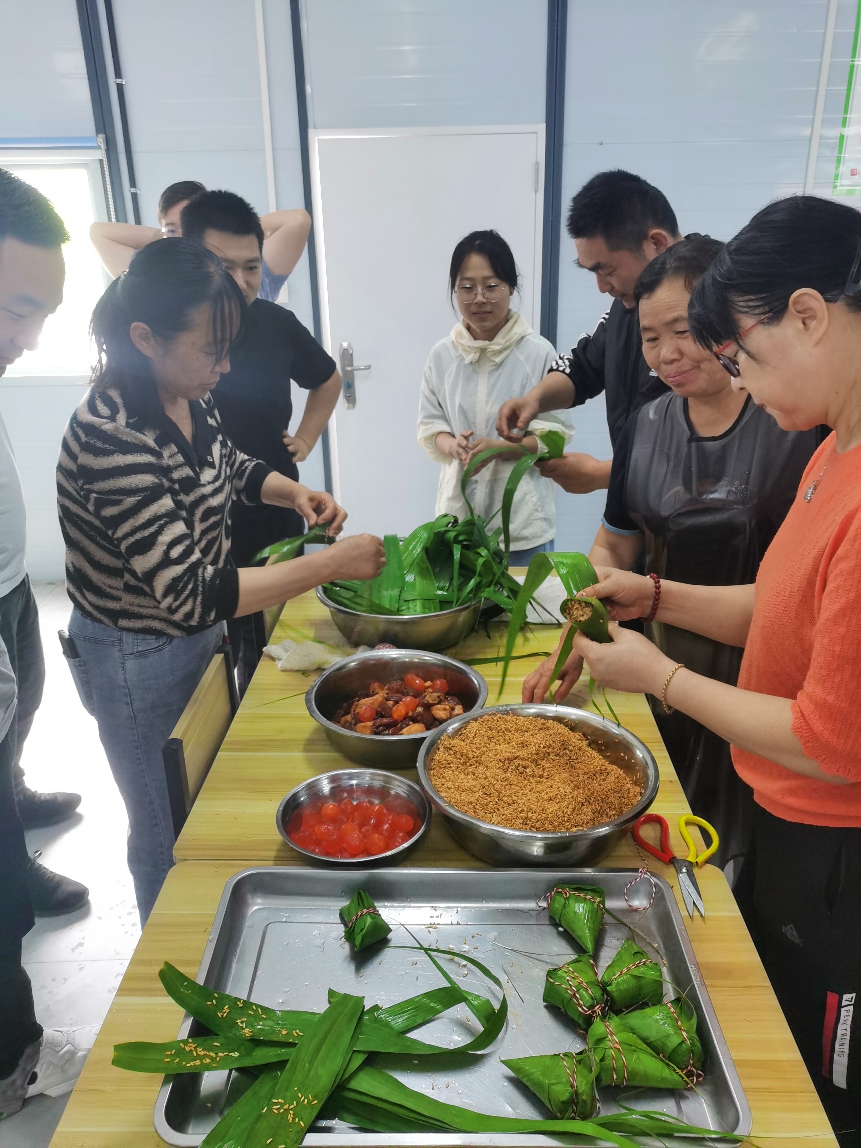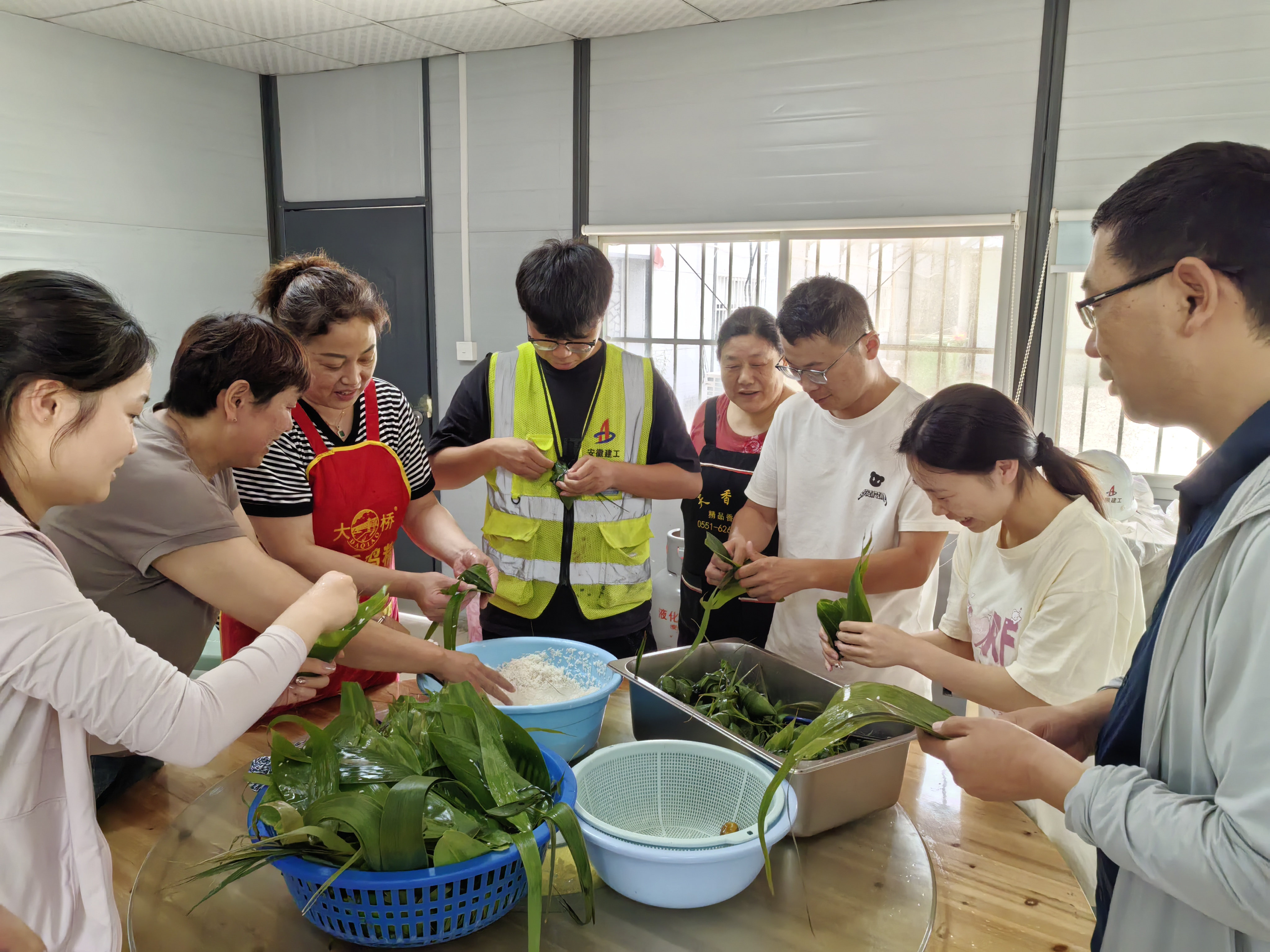 合肥理工學院項目組織管理人員包粽子,項目管理人員齊上陣,不一會,一個個翠綠誘人的粽子就呈現在大家眼前,項目部一派歡樂溫馨的氛圍。