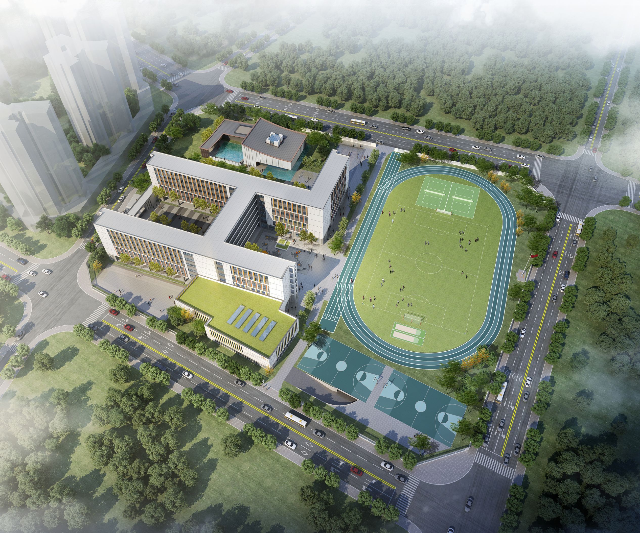 秦漢新城產(chǎn)教融合中心一期項目EPC工程總承包位于秦漢新城渭北片區(qū),規(guī)劃開設(shè)36個班級。建設(shè)內(nèi)容包括教學綜合樓、風雨操場、多功能廳等相關(guān)教育配套設(shè)施。該項目設(shè)計理念為“成長之樹”,建筑造型近似大樹生長的自然肌理,以柔和靈動的院落空間,既富有張力,也不失童趣?!盎幼呃取弊鳛橹鞲蓭臃种?,從物理空間上區(qū)分了不同年級,同時又相互交融,共同成長,讓所有孩子在“樹下”共同茁壯成長。