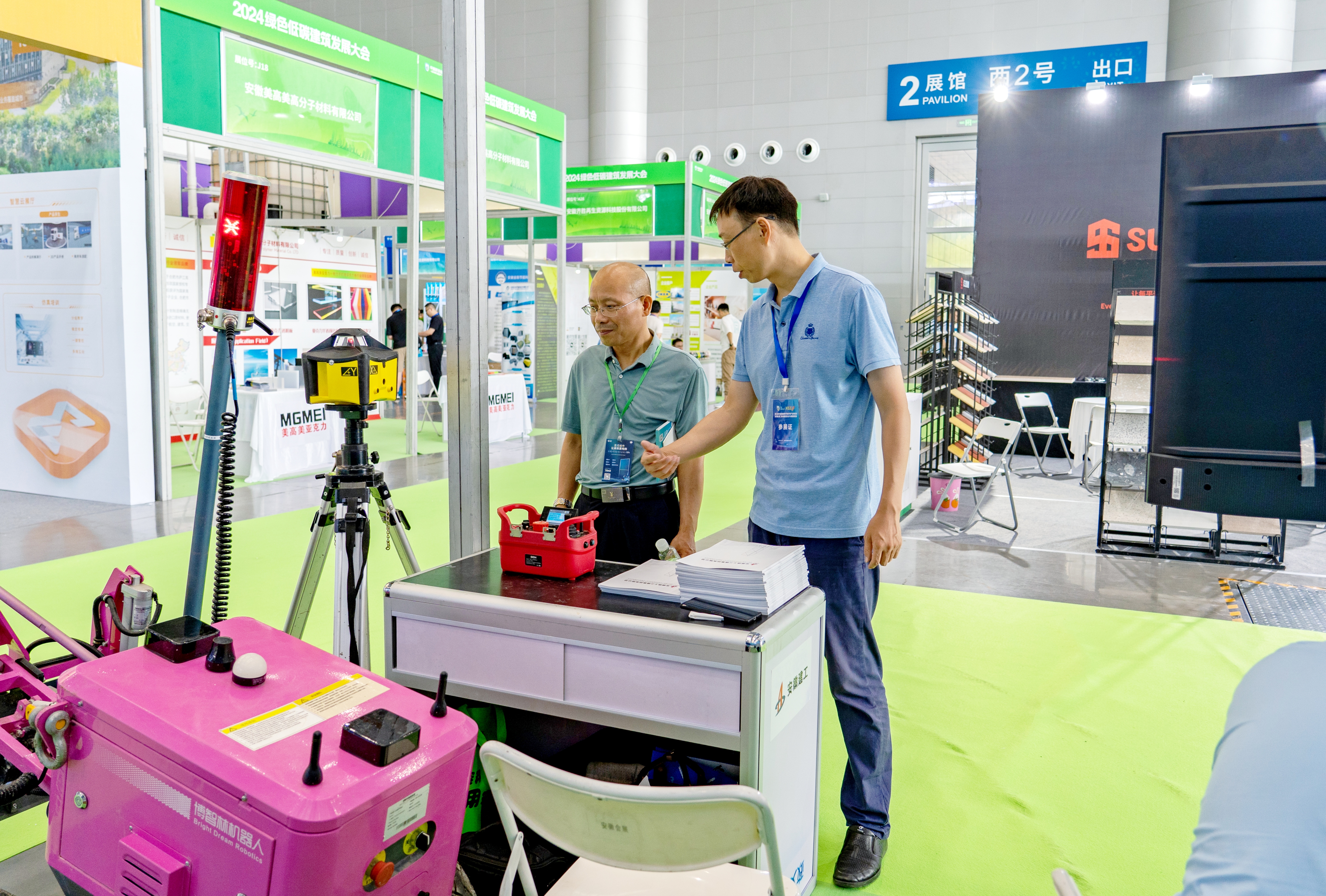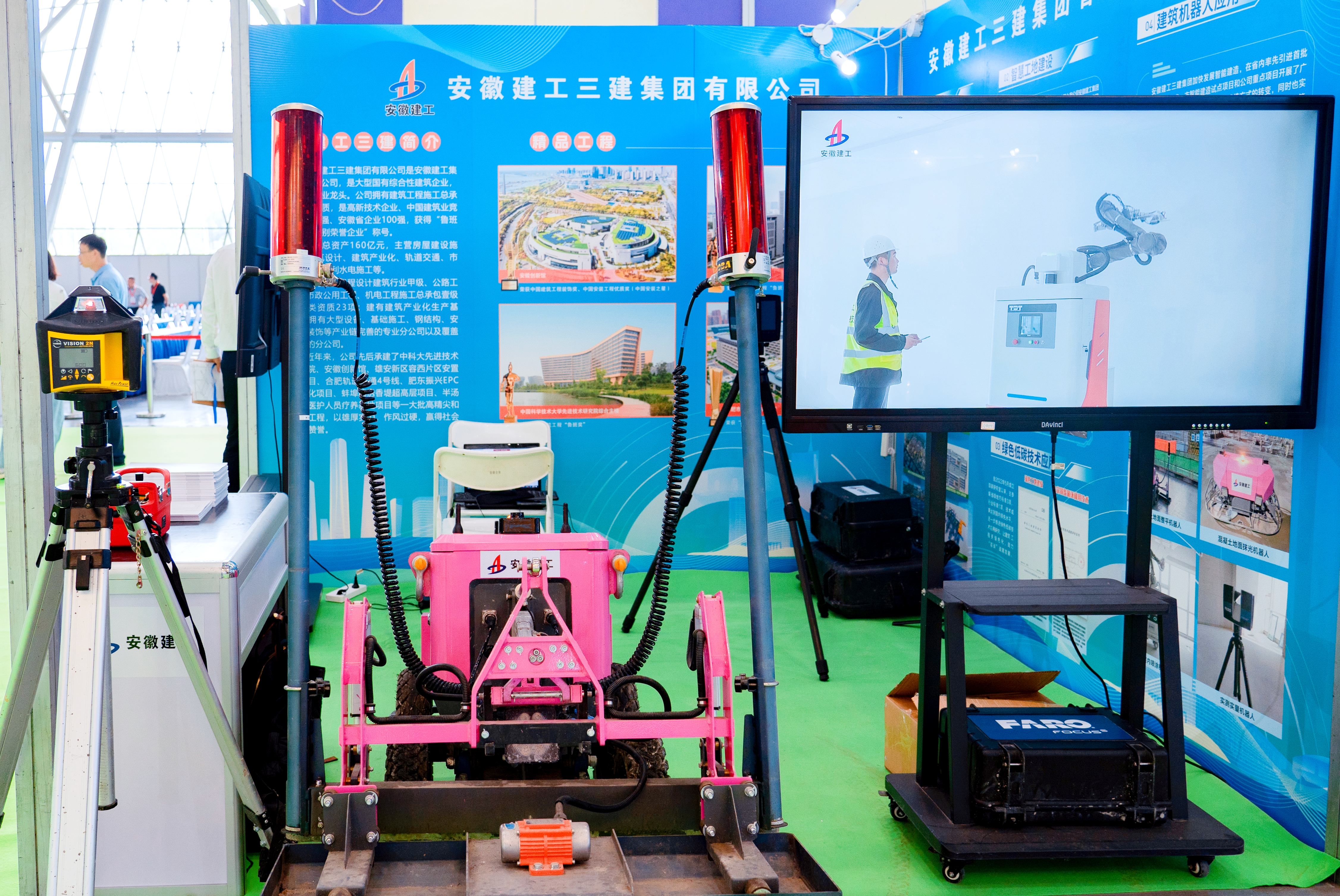 期間,通過(guò)宣傳片展播、展板介紹、宣傳冊(cè)發(fā)放和現(xiàn)場(chǎng)講解、機(jī)器人實(shí)物展示等多渠道,全方位展示建工三建在智能建造領(lǐng)域的發(fā)展成果,包括BIM技術(shù)應(yīng)用、智慧工地建設(shè)、綠色低碳技術(shù)應(yīng)用以及建筑機(jī)器人應(yīng)用等,其中混凝土整平機(jī)器人和實(shí)測(cè)實(shí)量機(jī)器人的出現(xiàn)備受現(xiàn)場(chǎng)觀眾的關(guān)注,紛紛上前了解機(jī)器人工作原理和應(yīng)用情況。