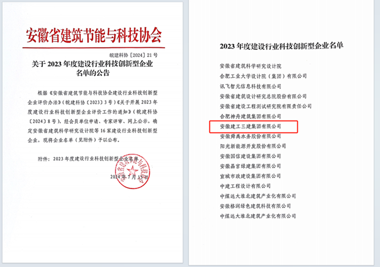 近日,安徽省建筑節(jié)能與科技協(xié)會公布“2023年度建設行業(yè)科技創(chuàng)新型企業(yè)”名單,安徽建工三建集團作為唯一一家省屬國有施工企業(yè)榮登榜單。