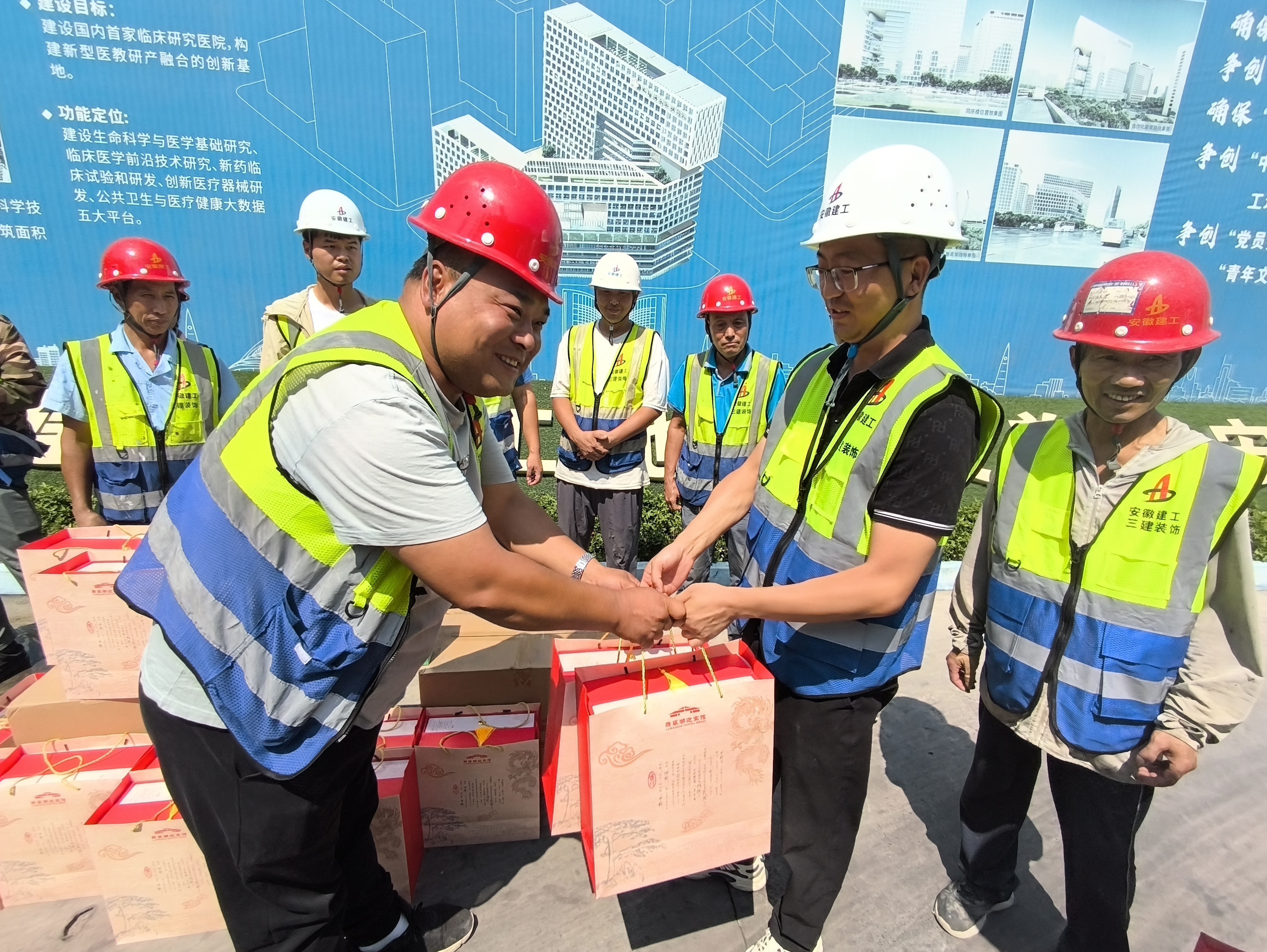 佳節(jié)“不打烊”,奮力“搶進度”。中科院項目建設(shè)者們搶抓工期,在這個闔家團圓的重要節(jié)日,主動放棄與家人團聚的機會,在項目上揮灑汗水、辛苦付出,為城市的現(xiàn)代化建設(shè)默默奉獻著。裝飾公司開展慶中秋慰問活動,為建筑工人們送上中秋月餅和中秋祝福。