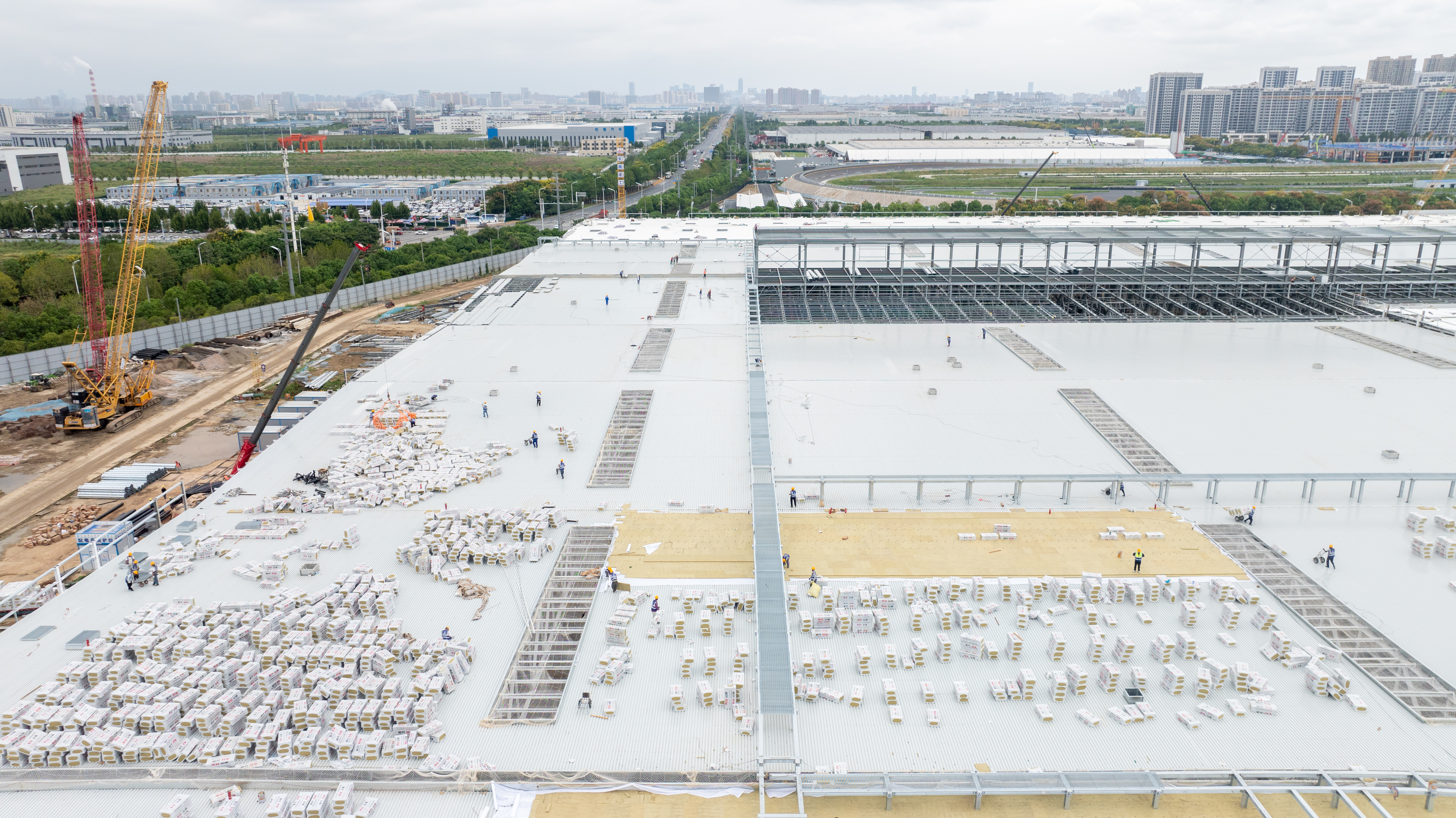 車間二鋼梁安裝2015件,完成率97%,屋面瓦安裝17000平方米,完成率40% ,樓層板鋪裝19000平方米,完成率80%;車間三屋面瓦安裝140000平方米,完成率95%,地坪澆筑完成40500平方米,完成率30%;車間四鋼梁安裝1690件,完成率100%,屋面檁條完成率70%,地坪及屋面瓦本周開始施工;車間五屋面瓦安裝33957平方米,完成率100%,地坪澆筑完成10300平方米,完成率40%。