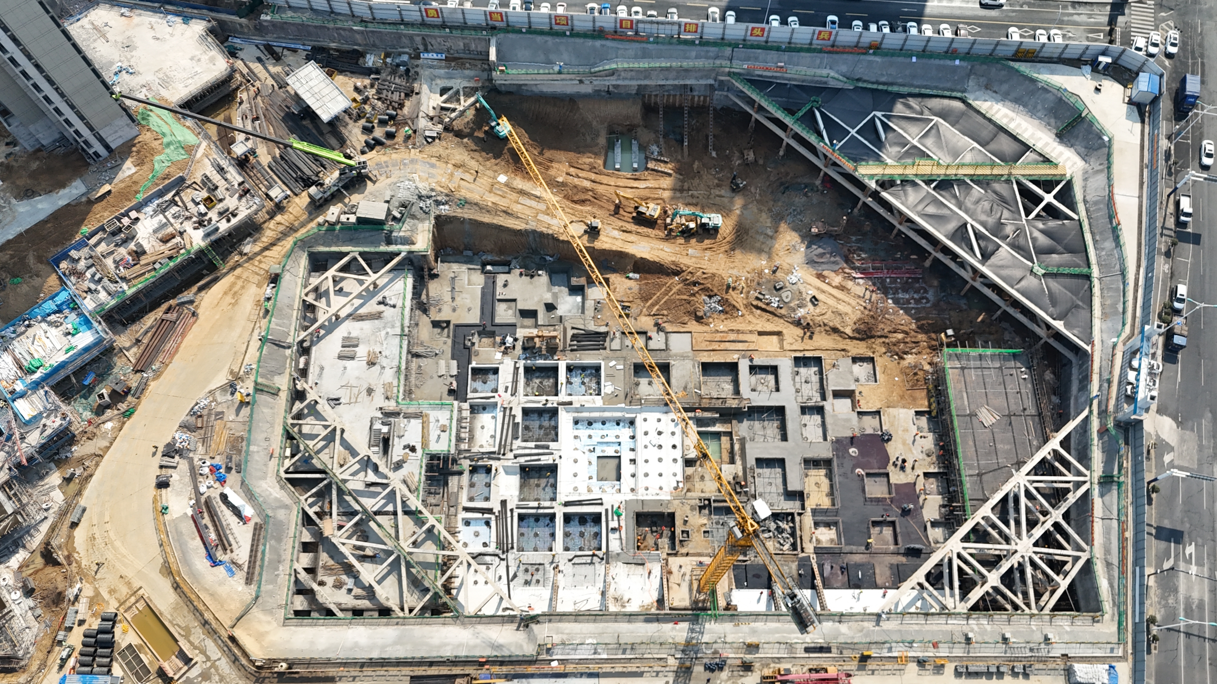 目前,項目正搶抓施工黃金期,組織各分包單位,兩班作業(yè),管理人員全程跟班,共同加緊基礎(chǔ)及地下室結(jié)構(gòu)施工,占地1萬平方米的基礎(chǔ)已完成近80%,負(fù)三層地下室已完成近40%,與住宅交界處地庫已完成近70%。