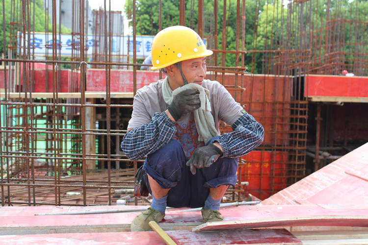 華力勞務(wù)公司中海新站區(qū)27#售樓部項(xiàng)目現(xiàn)場(chǎng),鋼筋師傅正在烈日下綁扎鋼筋