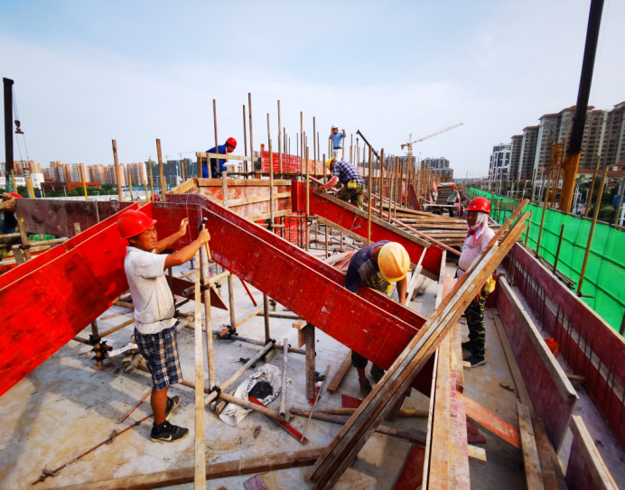 下午4點(diǎn),室外溫度依然居高不下,在安徽三建五公司東城悅苑項(xiàng)目現(xiàn)場(chǎng),工人師傅正在支模搶工期