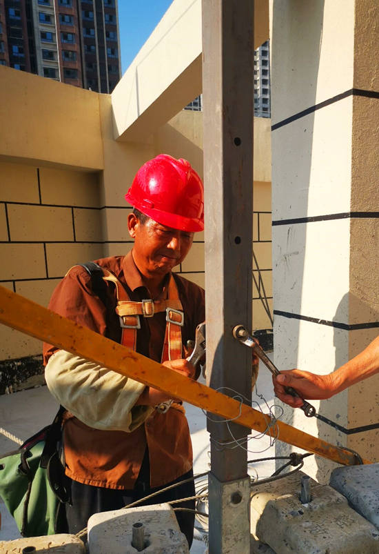 8月17日,烈日下,七公司濱湖沁園項(xiàng)目外架工正在安裝吊籃外架